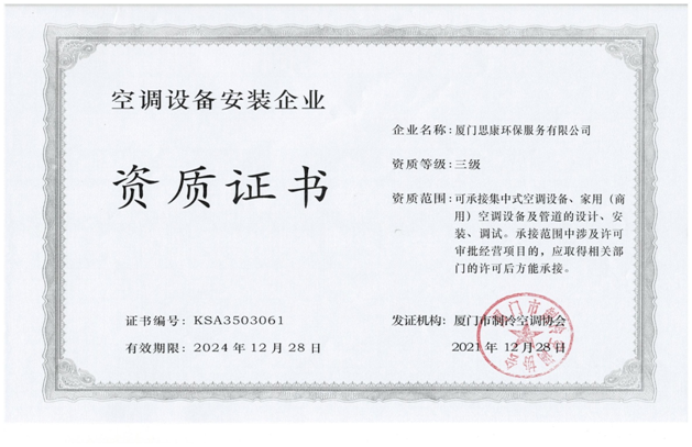 制冷設(shè)備清洗安裝三級(jí)資質(zhì)證書
