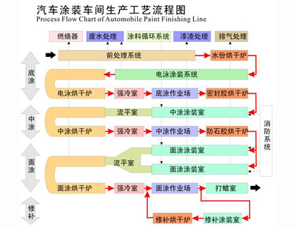 調(diào)漆室、油漆材料放置區(qū)、噴漆室、烘干房、增壓室、強冷室、空調(diào)供風系統(tǒng)、空氣供應系統(tǒng)、無塵室區(qū)。